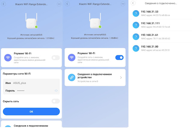 Как и в остальных усилителях экосистемы, новинка работает в двух режимах. Репитер может создавать свою WiFi сеть – к основной добавляется окончание _plus или изменяется имя на новое. Также можно задать отдельный пароль и скрыть сеть. Другой режим – Роуминг – то есть WiFi сеть репитера будет иметь тоже название и пароль как у источника.